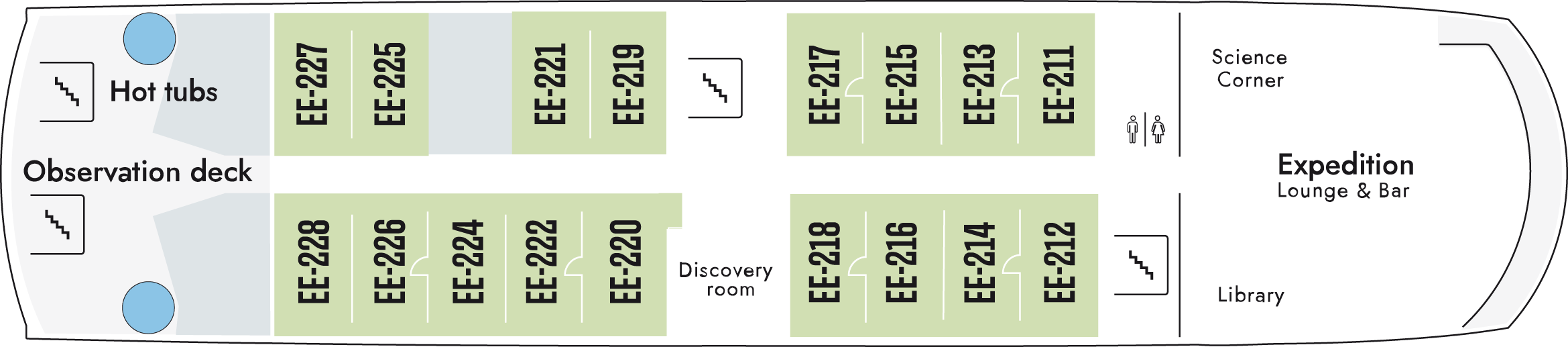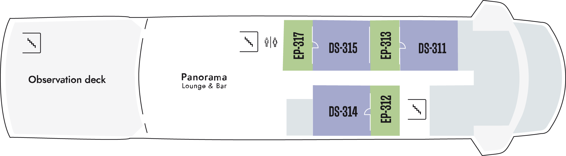 With comfortable spaces and large picture windows to illuminate the interior spaces and allow guests to take in the views, these cabins offer elegant relaxation areas after a day of active exploring. There are 3 Explorer cabins located as on the Panorama deck.
