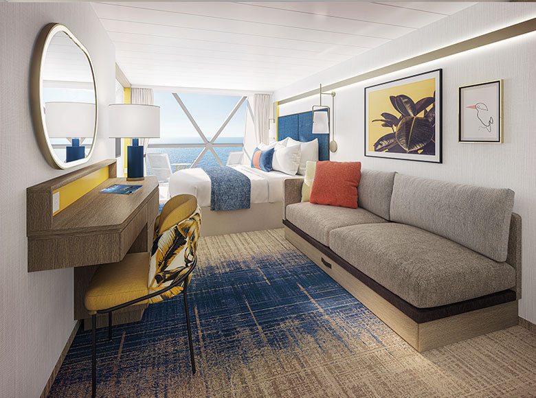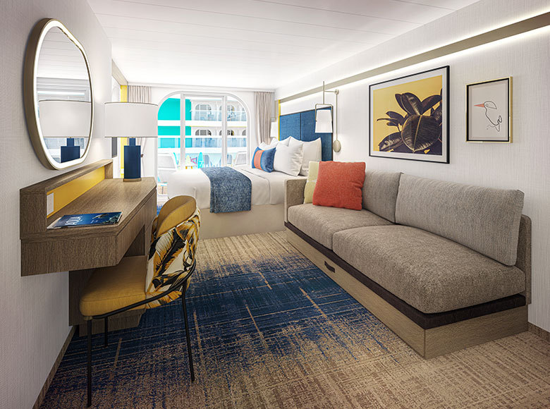 These staterooms offer you a private balcony with chairs and a table where you can sit back and relax. Size   Stateroom: 204 sq. ft. Balcony: 50 sq. ft.   Beds Two twin beds that convert to Royal King One single sofa bed in staterooms with up to 3 guests One double sofa bed in staterooms with up to 4 guests Occupancy Up to 4 guests Views Ocean view Living Spaces Room with bed, vanity and sitting area with sofa Bathrooms Full bathroom Shower with bench