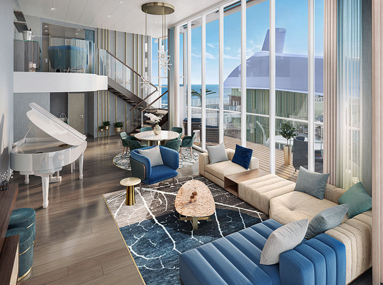 Stateroom Features Two-decks-high stateroom with panoramic views. Main level features a bedroom with closet and vanity and two twin beds that convert to Royal King; dining area with wet bar, piano, living room with sofa that converts to double bed; bathroom with shower and integrated bench. Master bedroom features a King size bed with Matermoll Summer Mattress; bathroom with tub, shower, two sinks, half bath (toilet compartment with sink); and a walk-in closet - all on the second level. Includes vestibule with mini bar and two lounge chairs (retreat) at the top of the stairs - vestibule serves as added privacy - and has no direct view to the bedroom. The Private balcony features whirlpool and dining area, bar with sink. Sleeps up to 6 guests. Stateroom: 2,088 sq. ft. (inclusive of the opening) Stateroom: 1,482 sq. ft. (excluding the opening) Balcony (main level): 705 sq. ft. This stateroom is available on these decks:  Deck Seventeen  Welcome to Royal Suite Class Royal Suite Class is an elevated onboard experience for suite guests, combining the unmatched range of innovative Royal Caribbean suite-category accommodations with superior service, exclusive access and personalization of guests’ cruise experiences. Within its three tiers — Star, Sky and Sea — this program offers exclusive access to lounges and dining venues while onboard, attentive services and additional stateroom amenities. Star Class Amenities‡ The new definition of VIP. It isn’t priority access — it’s all access. Make yourself at home in this most spacious and unbelievable suite at sea, and let your Royal Genie take your VIP status ship-wide. Exclusive Access to Royal Genie Service All Day Access to Coastal Kitchen* Complimentary Specialty Restaurants* (including Chef’s Table and à la carte dining) Complimentary Deluxe Beverage Package (for guests 21 years or older, or 18 and over where applicable by law) Complimentary Refreshment Package (for guests under legal drinking age) Still and Sparkling Water Replenished Daily Complimentary GratuitiesΔ Complimentary VOOM**, The Fastest Internet at Sea Expedited Boarding and Departure Best Seats in the House in Select Entertainment Venues Priority Entrance to Many Onboard Activities†† Suite Lounge Access (complimentary hors d’oeuvres and cocktails each evening) Access to Suite Sun Deck Royal Caribbean Plush Bathrobes for Use Onboard Complimentary Minibar stocked with Coca-Cola® Beverages and Water Complimentary Laundry and Pressing Services Luxury Mattress and Pillows Frette® Linens Luxury Bathroom Amenities Lavazza Espresso Coffee Maker