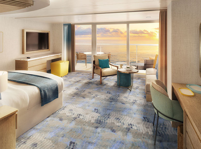 Sunset Junior Suite  Stateroom FeaturesBedroom area with two twin beds that convert to Royal King. Full bathroom with tub. Seating area with sofa that converts to double bed. Private balcony. Sleeps up to 4.Stateroom: 322-330 sq. ft.Balcony: 115-130 sq. ft.This stateroom is available on these decks:  Deck Ten The Royal Suite Class is an elevated onboard experience for suite guests, combining the unmatched range of innovative Royal Caribbean suite-category accommodations with superior service, exclusive access and personalization of guests’ cruise experiences. Included are exclusive access to lounges and dining venues while onboard, attentive services and additional stateroom amenities.This is Sea Class — and you can rest and recharge between adventures in a spacious suite where every detail has been carefully considered with you in mind. From luxury pillow top mattresses to bath amenities selected to make you feel at home. The indulgence extends beyond your room with evening dining at Coastal Kitchen.Sea Class Amenities:• Dinner at Coastal Kitchen, based upon availability*.• Royal Caribbean Plush Bathrobes for Use Onboard• Luxury Pillow Top Mattress• Luxury Bathroom Amenities• Lavazza Espresso Coffee Machine