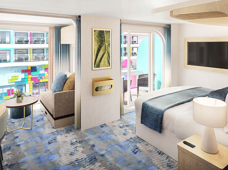 Stateroom Features Bedroom area with two twin beds that convert to Royal King. Split bathrooms with a shower, sink and toilet and sink. Sitting area with sofa, converts to a full bed. Private balcony with Surfside neighborhood view.  Sleeps up to 4. Stateroom: 269 sq. ft. Balcony: 53 sq. ft. This stateroom is available on these decks:  Deck Nine |  Deck Ten |  Deck Eleven   The Royal Suite Class is an elevated onboard experience for suite guests, combining the unmatched range of innovative Royal Caribbean suite-category accommodations with superior service, exclusive access and personalization of guests’ cruise experiences. Included are exclusive access to lounges and dining venues while onboard, attentive services and additional stateroom amenities. This is Sky Class — spectacular accommodations, attentive service and exclusive experiences. As Sky Class guests, you have access to a Concierge who crafts your personal adventures, from restaurant reservations to recommendations for shopping or dining at ports of call. Sky Class Amenities: • Concierge Service • All Day Access to Coastal Kitchen* • Specialty Bottled Water (upon arrival) • Complimentary VOOM, The Fastest Internet at Sea † • Flexible Arrival Boarding & Priority Departure • Priority Dining Reservations • Venues Early Access to Seating in Select Entertainment Venues • Suite Lounge Access (complimentary hors d’oeuvres and cocktails each evening) • Access to Suite Sun Deck • Royal Caribbean Plush Bathrobes for Use Onboard • Luxury Pillow Top Mattress • Luxury Bathroom Amenities • Lavazza Espresso Coffee Machine