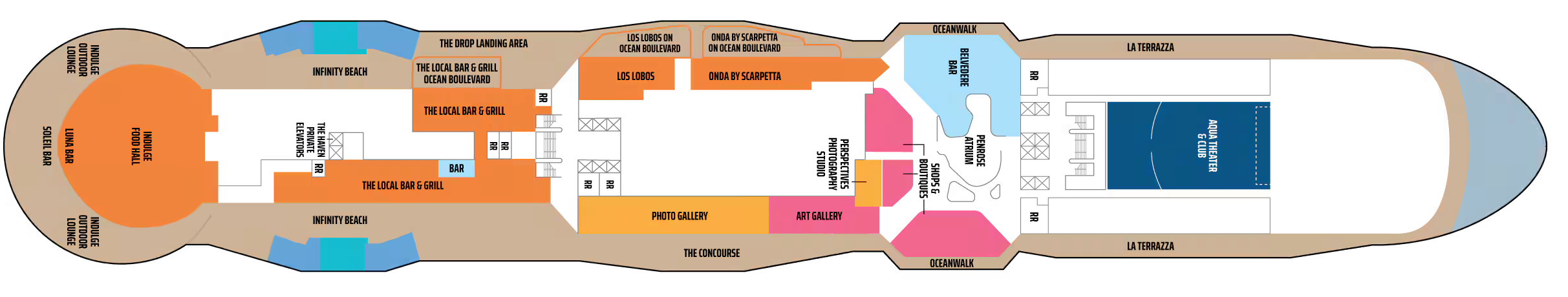 Located on either side of the ship on Ocean Boulevard, Norwegian Aqua's extended Infinity Beach boasts vast scenic views against the stunning horizon from every angle. Submerge in an infinity pool and watch the world go by in total serenity. Lounge in the sunlight on top a lush chaise bed resting over a blanket of water for dipping your toes in. Enjoy a cocktail, some music and drift into infinity in this stunning seaside oasis.