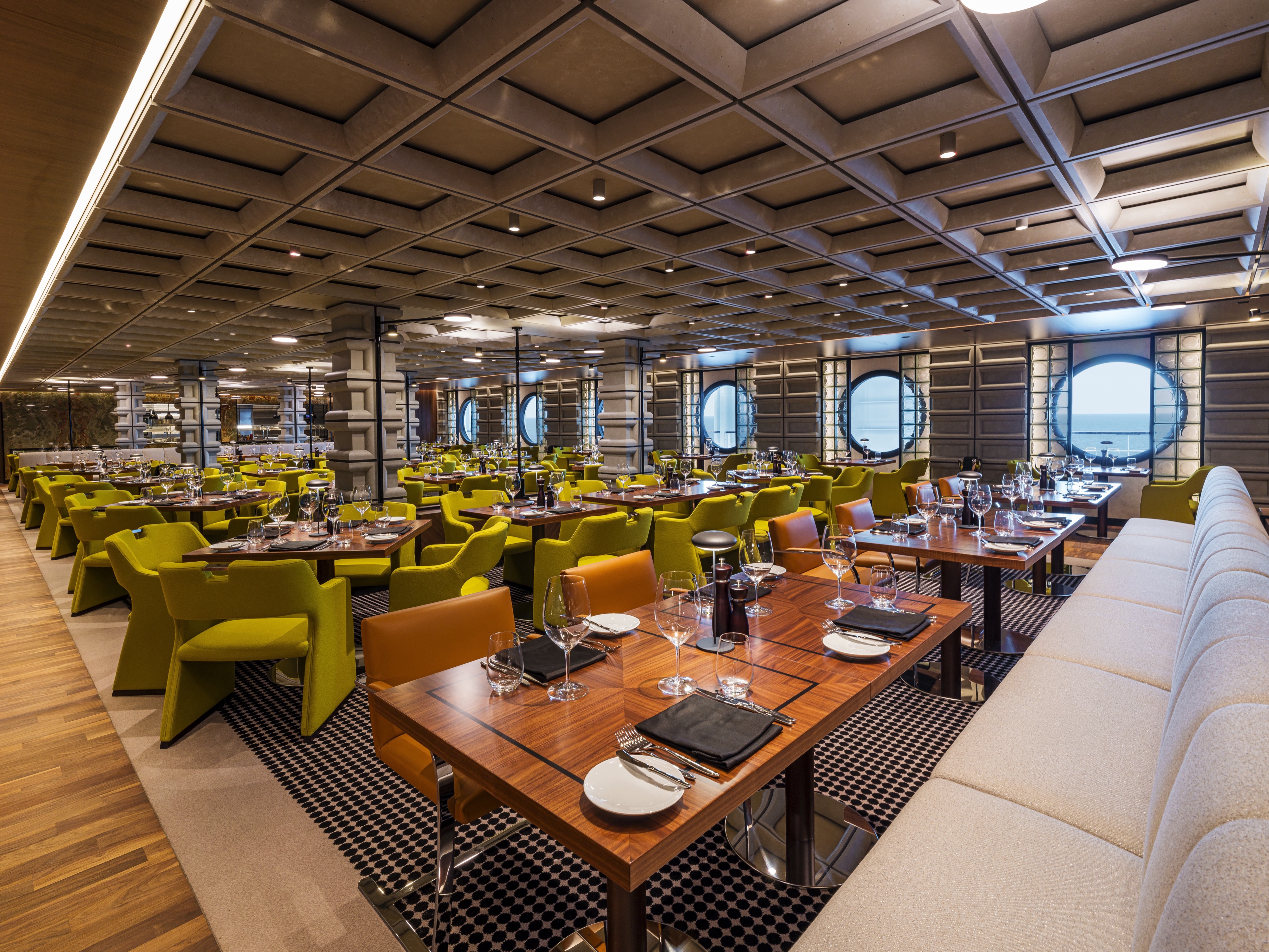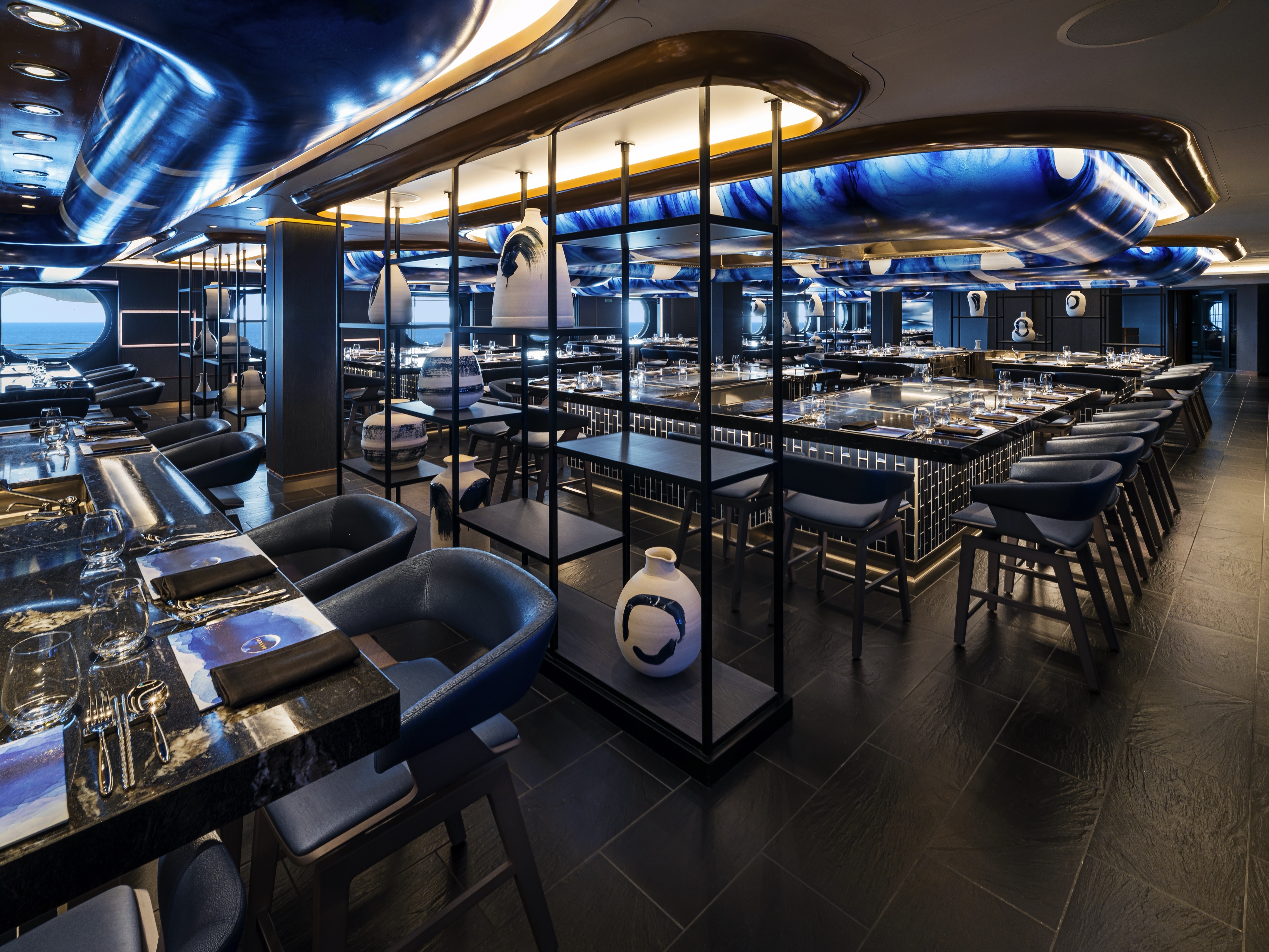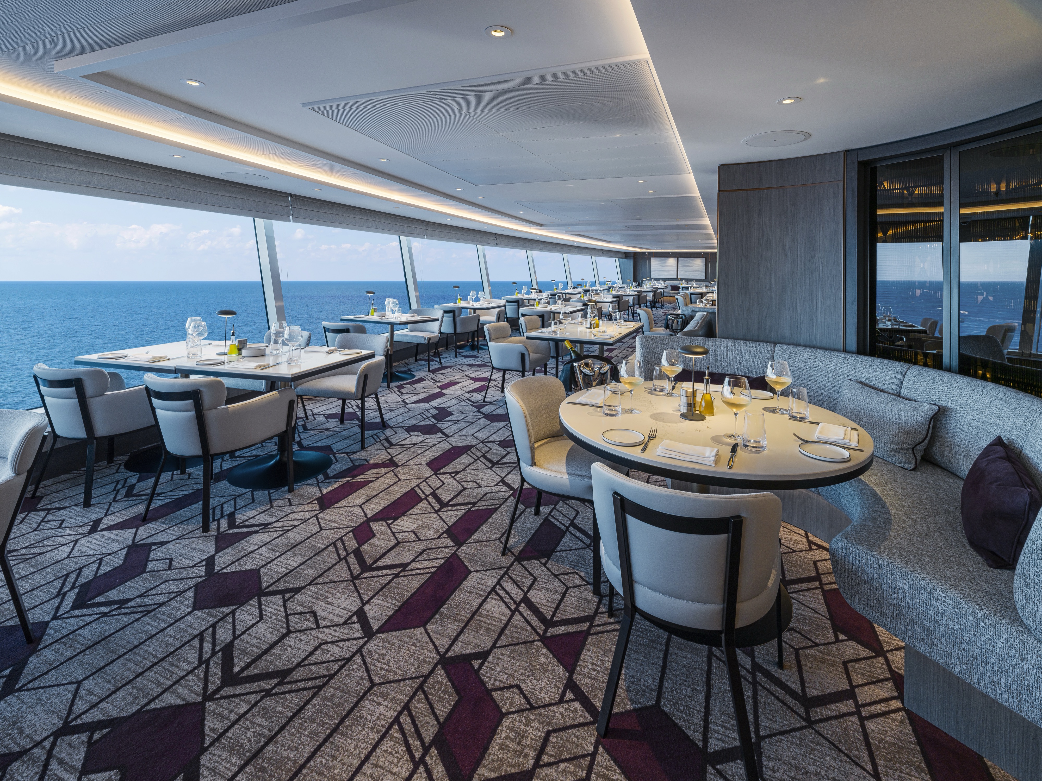 Designed to blend both indoor and outdoor experiences with stunning views of the ocean through grandiose floor-to-ceiling windows for panoramic views from the ship’s bow.