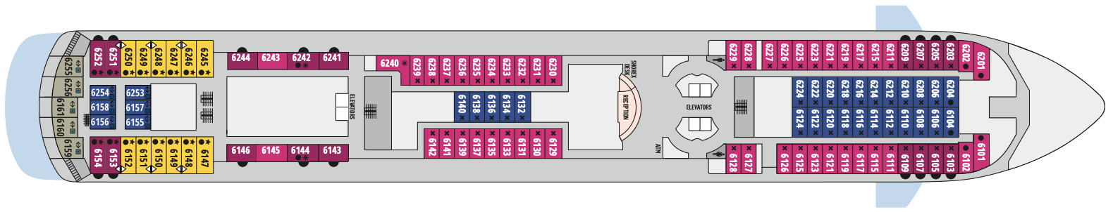 She offers 633 staterooms, 62 of which feature balconies, in total accommodating up to 1,266 guests.