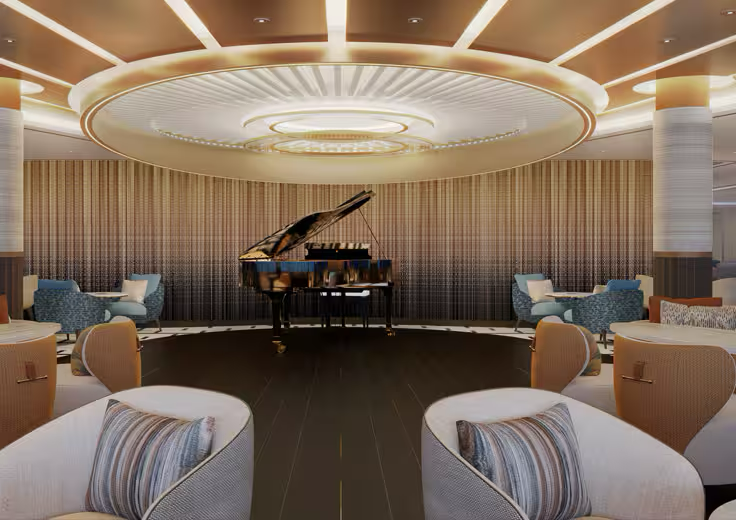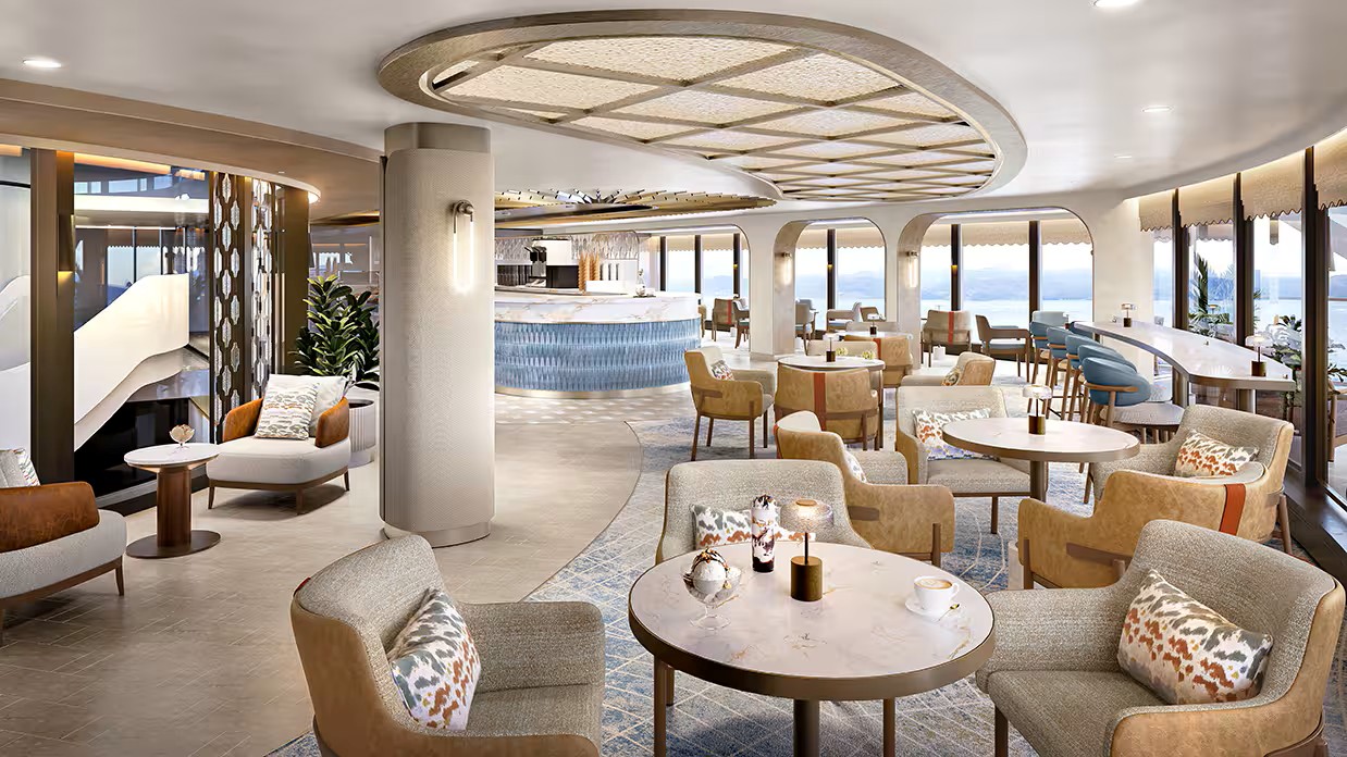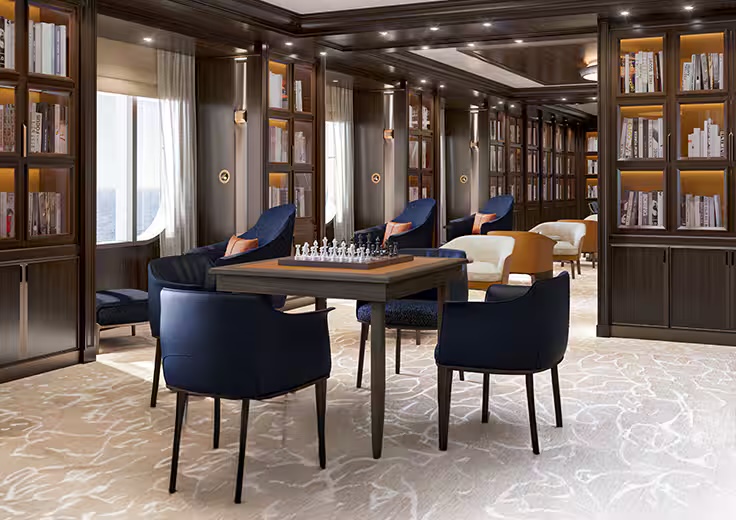 Aptly named, Horizons captivates with dramatic floor-to-ceiling windows framing 180-degree vistas of the sea. This lounge celebrates the journey itself, offering a serene setting to savor the passage while glimpsing the allure of destinations that lie ahead. Comfortable furnishings in soothing tones invite guests to relax and linger, creating a sense of home even as the panoramic views assure you that you are far from it.