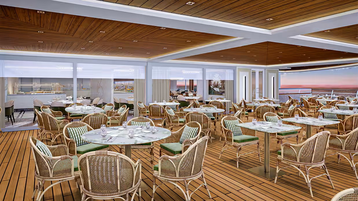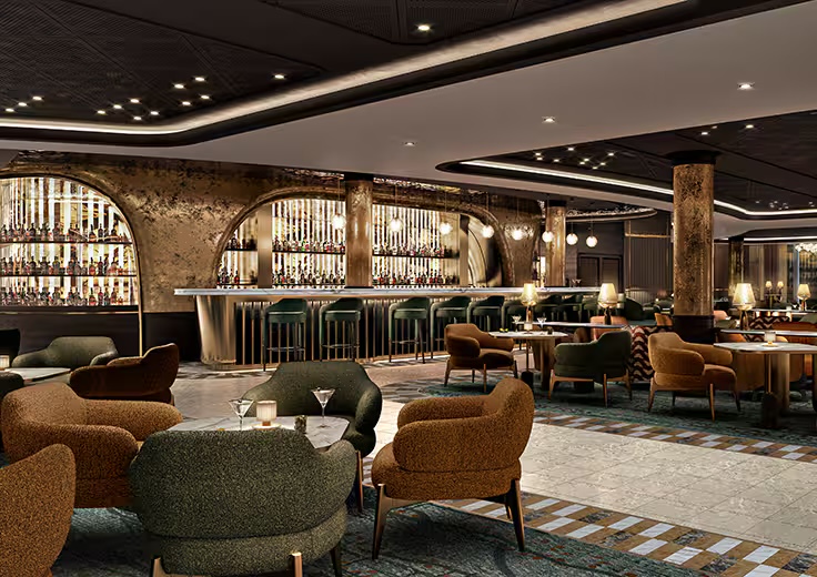 The Pool Deck celebrates the sea with a design inspired by nature’s serenity. Organic textures, soothing tones and thoughtful details create a tranquil escape where the beauty of the ocean is never far from view. Recline in a shaded cabana or unwind poolside at Waves Bar with a refreshing cocktail in hand, letting the gentle sea breeze and sunlit waters set the tone for a leisurely day at sea.