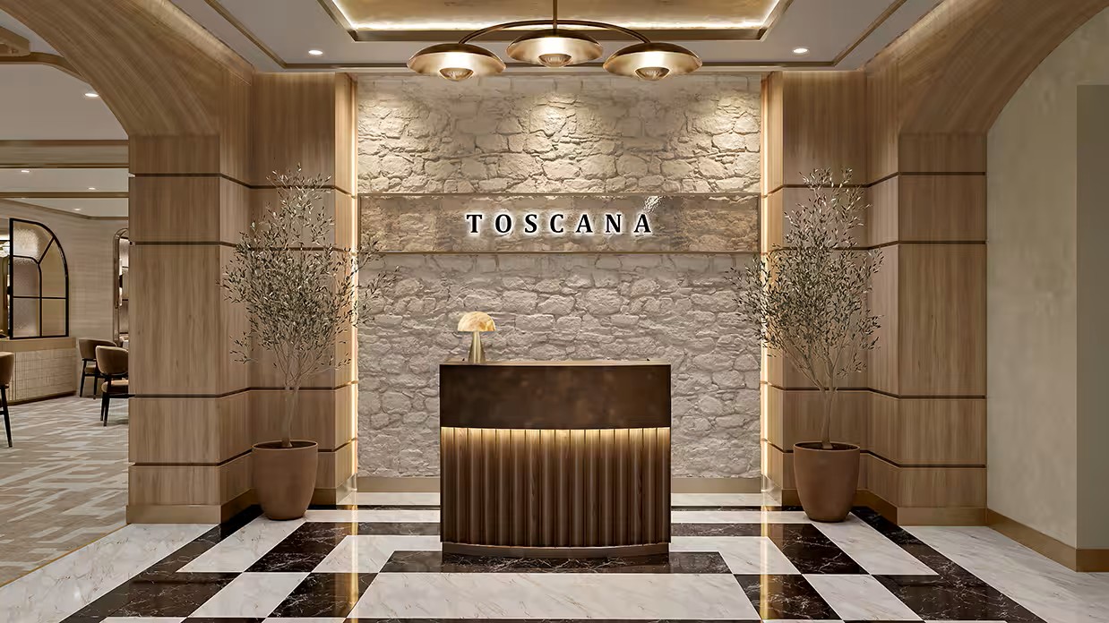 Beautiful scenes of the fertile Tuscan countryside adorn Toscana, an artistic expression of the authentic dining experience awaiting guests. Simple yet keenly balanced, Tuscan cuisine evolved from rich family traditions, epitomized within Toscana, where many of our recipes originated with the grandmothers and mothers of our own Italian culinary staff. Presented on elegant, custom-designed Versace china, each dish is a masterpiece that exemplifies the essence of Tuscany. Relish antipasti like carpaccio of beef topped with aged Parmigiano-Reggiano or sautéed jumbo scampi tenderly wrapped in Proscuitto san Daniele. Enjoy a traditional porcini mushroom risotto with caramelized shallots and fresh thyme. Savor delectable entrées such as a tender bone-in milk-fed veal chop grilled to perfection and topped with sautéed porcini wild mushroom sauce.