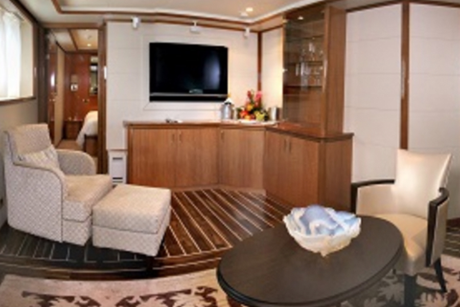 For the ultimate in nautical experiences, reserve the new Officer’s Suite located close to the Bridge where our own ship’s officers have their quarters. With its unique “insider” location and 242 square feet of comfort, the nautically appointed Officer’s Suite offers an experience you won’t find on any other cruise line.