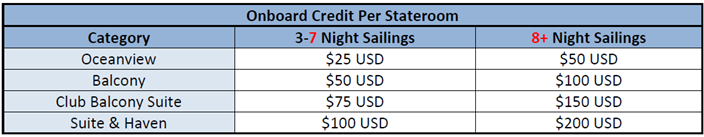 - Onboard credit offer is per stateroom, in U.S. Dollars and will be applied to 1st and 2nd guest on the reservation