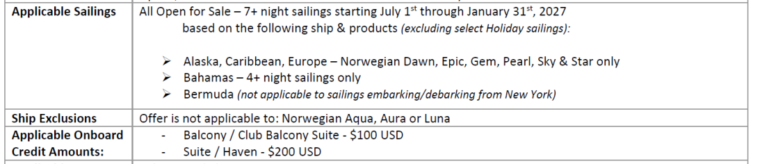 - Offer is subject to change at any time per Norwegian Cruise Line's discretion. Other restrictions may apply